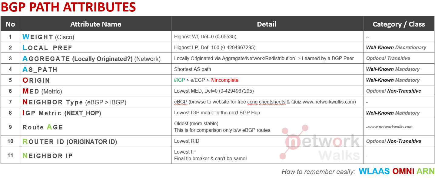 BGP uses multiple attributes or metrics for best path selection which are Weight (cisco), LOCAL_PREF, aggregate, as_path, origin, MED, neighbor type (ebgp > ibgp), igp metric (next_hop), route age, router ID (originator ID), Neighbor IP